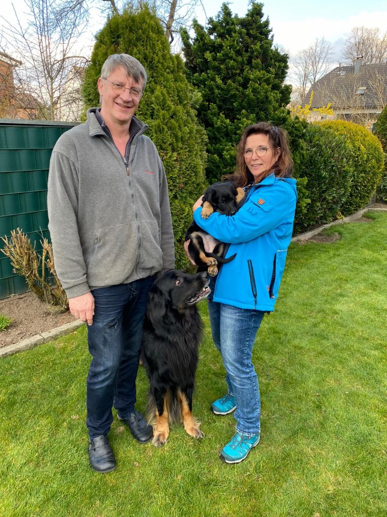 Seit 1998 sind wir mit dem Hovawart-Virus infiziert. In dem Jahr haben wir bei Bekannten zum ersten Mal einen stattlichen Hovawart-Rüden kennenlernen dürfen. Als Hover aus seinem Hovimobil ausstieg, war es wortwörtlich um uns geschehen. Es war „Liebe“ für diese Rasse auf den ersten Blick.